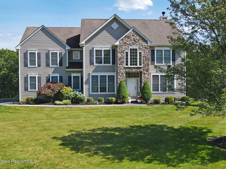 This meticulously maintained and beloved Colonial home in a beautiful community sits on an oversized 1.2 acre landscaped lot, offering privacy and views from its expansive oversized windows, the trex deck and stone inlaid patio! Enjoy almost 3,000 sqft. of finished space with a full basement that can also be completed having the plumbing for an additional bathroom in place and sliding glass doors that lead to the spacious stone patio. The paved driveway has plenty of parking for visitors and the two car garage with additional storage leads you into the home; next to the laundry room, half bath, walk in pantry and eat-in kitchen for easy transport of groceries. The kitchen is a chef's dream, having an abundance of counter space, an island, and even a dry bar that connects to a formal dining room. Off of the dining area of the kitchen is a set of sliding glass doors that lead to an updated trex deck with stairs to the patio and tree lined backyard. The living room is light and airy with two-story high ceiling and a wall of windows as well as a wood burning fireplace. A cozy family room completes the main level. Upon entering the front door, your senses are delighted by the natural light from the many windows, openness of the floor plan and view of the second floor hallway. The second floor features a capacious primary bedroom with a high ceiling, two walk-in closets, a double sink bathroom with a walk-in shower and a separate tub. There is another full bath shared among the other three sizable bedrooms. One of which also has a walk-in closet. The hallway opens up to overlook the bright living room and foyer continuing to delight the sense of integrated space and flow of this charming home. The community features a clubhouse, in-ground pool, tennis courts and playground; just a short stroll or drive away. Affordable 98.00 monthly HOA includes the maintenance of these enjoyable spaces, as well as recycling and refuse removal. Municipal water and sewer add to the peace of mind of low maintenance and quality living.