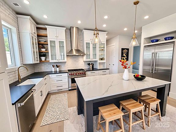 Discover this stunning newly constructed 4-bedroom, 3-bath home in the heart of Brevard, within walking distance to parks, bike paths, and trails. The main level open layout features 10-ft ceilings, 8-ft doors, and wide French oak hardwood floors throughout. A spacious great room with fireplace flows into the dining area and chef's kitchen equipped with Viking stainless steel appliances, honed granite countertops, abundant cabinetry, and a large island. This level includes an oversized vaulted primary suite with a spa-like bath, two additional bedrooms, a full bath, and screened deck. Upstairs, you'll find a spacious fourth bedroom, large full bath, expansive living/media room, and a dedicated office space. Thoughtful details include architectural gutters with copper rain-chains, low-maintenance brick and cement siding, and a two-car garage. This is a move-in-ready home in desirable Brevard.