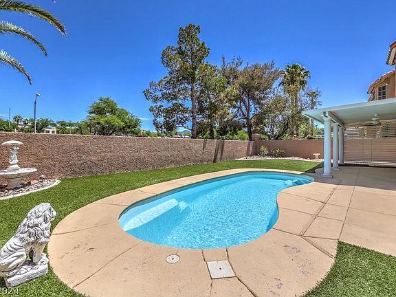 LOCATION, LOCATION, LOCATION! This gorgeous 5 BED 3 BATH home with 3 CAR GARAGE and sparkling POOL is in a fabulous location in Legacy, 5 minutes to the District in Henderson and Lee's Family Forum Arena! Minutes away from the 215 Interstate. Inside the home boasts large kitchen with granite countertops, pantry, dinning nook, ample cabinet and counter space. Living room, family room w/ fireplace and wet bar, guest bed and bath, and formal dinning room downstairs. Upstairs you will find the separate laundry room, 4 guest bedrooms and spacious Primary Suite w/ walk in closet and amazing updated primary bathroom with NEW HUGE DUEL walk in shower(s) and duel sinks. Central vacuum system and NEW water heater installed 2024. This multi-level 3,225sft home has all you could want for your private retreat. The low maintenance backyard offers covered patio and beautiful pool great for evening gatherings. The 3 car garage has lots of storage for tools and toys! Come make this home yours today!