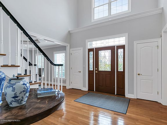 Stunning colonial w/striking two-story light filled foyer & family room. The open floor plan of the kitchen and family room renders itself as the perfect place to gather and enjoy your home. Formal living room and dining room both feature lighted tray ceilings. Master has been freshly painted with new wall to wall carpeting, 2 walk-in closets and en suite bath. Additional den/office on first floor could be 5th bedroom. High ceilings in basement w/painted walls has been plumbed for a bath & is additional space for a gym or recreation. Property has a very private fenced in rear yard. Walk to downtown Red Bank with all it has to offer. Convenient to all transportation, restaurants, theater and schools. Priced below assessed value. Just a great place to live!