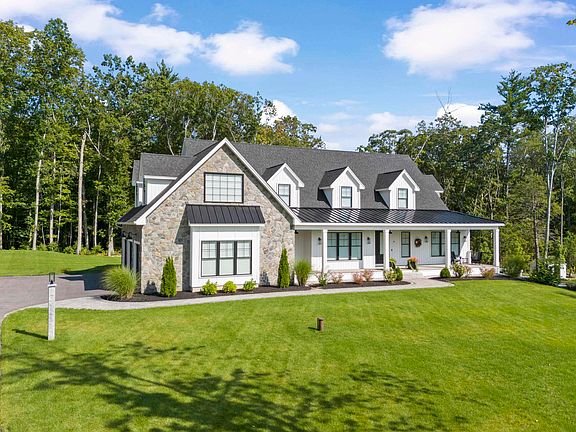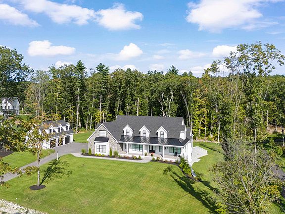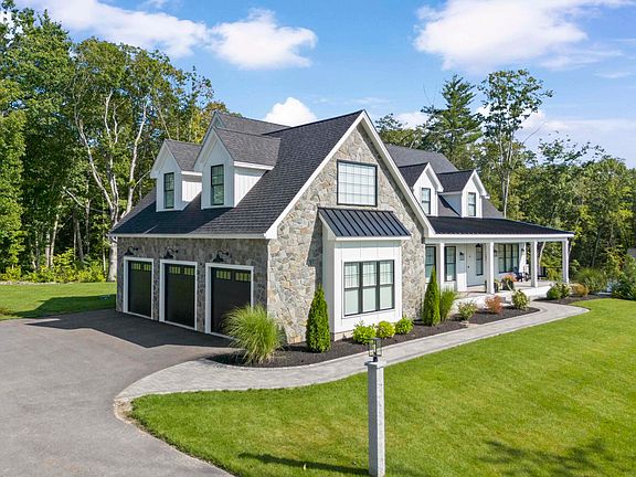 This Modern Farmhouse sits on a 1.3-acre lot in one of Hollis’s most desirable new subdivisions, just minutes from Route 3. Inside, thoughtful upgrades include hardwood floors, tile baths, custom closets, and custom blinds in every room with blackout options in the bedrooms; all secured by a state-of-the-art system. The first floor features a gourmet kitchen with a large center island, dual dishwashers, a butler’s pantry with second refrigerator, and a striking black-and-gold range. The kitchen opens to a dining area and living room with built-ins, a stone gas fireplace, and atrium doors to the back patio. A private office with built-ins and a sitting room overlooking the farmer’s porch add flexible living spaces. The main-level primary suite boasts two custom walk-in closets, a soaking tub, and a spacious tiled shower. Upstairs are four bedrooms—two with en-suites and two sharing a full bath—plus an oversized laundry room with cabinetry. The finished lower level offers two rooms ideal for an in-law setup, a full bath, wet bar with leathered granite, and media room. Outside, the yard offers room to add a pool. Parking is abundant with a 3-car attached garage plus a 3-car detached garage, prepped for a half bath and ready to finish. This is a rare opportunity to enjoy modern luxury, thoughtful details, and the beauty of Hollis all while living in close proximity to Nashua.