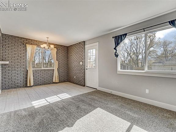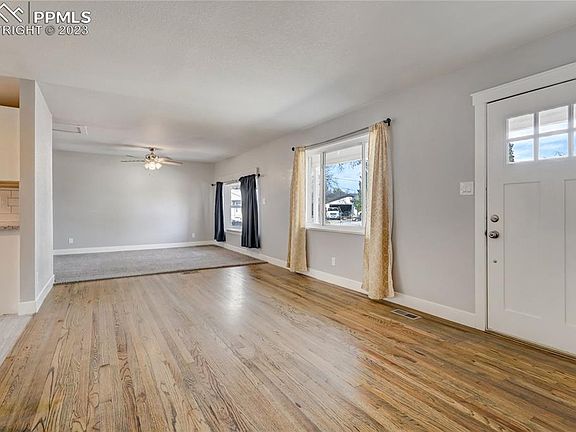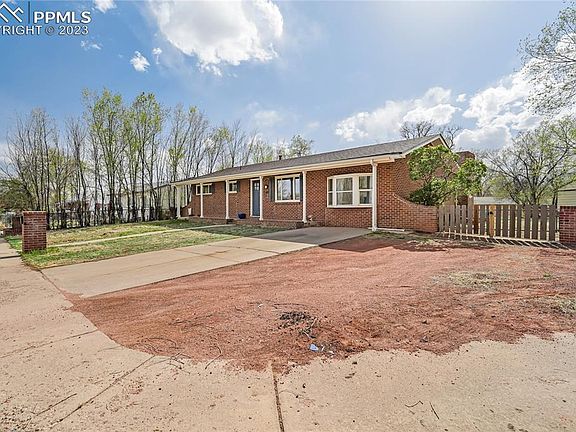 Beautiful brick ranch style home ready for its new owners! This adorable home greets you with a covered front porch. Step inside where you are welcomed by a spacious and bright living room with original hardwood flooring and a lovely bay window with seating. Kitchen features white shaker style cabinets, solid surface counter tops, subway tile and stainless steel appliances. Step down to the roomy walk-out dining area with pass through counter bar from kitchen. The cozy family room features a lovely brick adorned wood burning stove. Off the family room sits a large laundry room with 2nd bathroom. The home has three good size bdrms with hardwood flooring. Full bathroom located next to the three bdrms. Outback there is a concrete patio and huge fenced backyard great for kids and pets and a large shed for extra storage and room for RV parking! Home sits on the corner of a cul-de-sac in a quiet established neighborhood. Close to schools, shopping and more. Easy access to Ft. Carson and I-25. Home is being sold "as is".