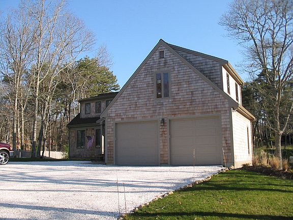 Contemporary Half-Cape with deeded access to Follins Pond for fishing and boating, just around the corner, and close to some of the Cape's best beaches. Corner lot, with 2 garages and 2 driveways, so there is plenty of parking for vehicles and your boat! With a flexible floor plan, this home offers comfort and relaxation, as well as more formal living spaces. A combination kitchen-family room has a breakfast bar, dining area, and antique brick, wood-burning fireplace. There is a more formal living room, as well as an impressive dining room with French doors and a cathedral, beamed ceiling, leading out to the deck overlooking the yard, for more entertaining. The first floor also boasts a master suite and a laundry room with a half-bath. Two bedrooms and a small office round out the upstairs. Potential, additional living space above the 2 car garage, already plumbed and wired. The other garage is over-sized and is a walkout from the basement and currently used by the owner as a wood shop