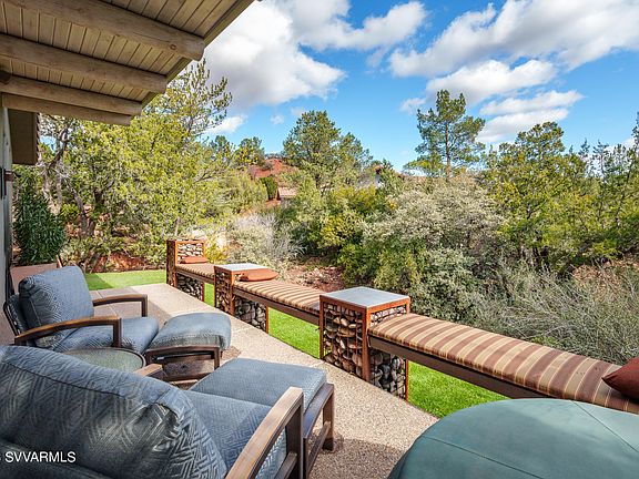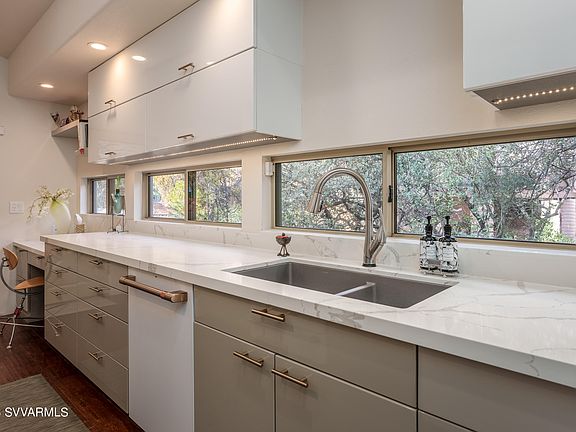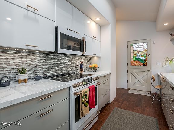 Fully remodeled Euro/Modern design home with direct red rock views and clean lines situated in the middle of Sedona within a mile of restaurants, grocery stores and endless trails. If design aesthetic and unblockable views are your top criteria -this is hands down the best value in Sedona. Every room has unique custom features including metal and ripple textured tile fireplace wall, radius walls, concrete wall tiles, offset art glass accents, inset master bedroom deco wall. Main living room has a full wall of glass to capture direct views of the red rocks while the exterior patio offers afternoon shade and is ideal for sunset views. Two story home with master on the upper level to capture elevated views. Efficient kitchen showcases Cafe appliances and Euro cabinets with Quartz countertops