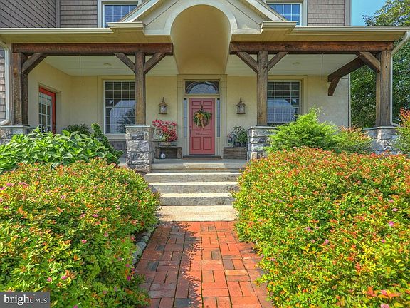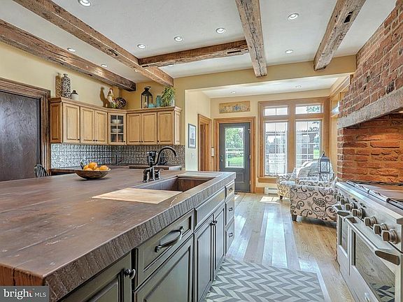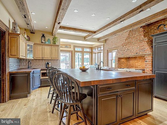 Gorgeous farmhouse with large addition and modern kitchen. Work completed by Kinsley Construction. Kitchen has beamed ceiling, hardwood floor, walk-in pantry, upgraded appliances, huge center island with built-in refrigerator, freezer and icemaker, seating area, access to outdoor kitchen and patio. Formal dining room with hardwood floor, crown and chair molding. Library with built-ins and hardwood floor. French doors to spectacular family room addition with hardwood floor, gas log fireplace, built-ins, wet bar with wine refrigerator and double doors to outdoor entertainment area. Master suite with cathedral ceiling, double doors to private balcony, walk-in closet. Luxurious master bath with heated ceramic tile floor,double bowl vanity with granite top, spacious walk-in ceramic tile shower. 4 additional bedrooms and additional bath. Walk-up floored attic could be used as additional living space. Stunning outdoor living and entertainment area with kitchen, patio, deck, inground diving pool. 2 car oversize garage with water, electric, modine heater and hookup for generator that can be back fed to house. 4 zone heat in house.