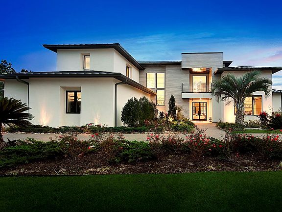 Exquisite contemporary custom built home in 24-hour guard gated Carlton Woods Nicklaus! Located on a .65-acre lot, with a gated entry, circular drive, and 4 car garage, this exceptional home is both elegant and inviting. Dual glass and iron entry doors lead you inside, where you'll notice impressive ceiling heights with decorative wood beams that add warmth and dimension, as well as stunning light fixtures. A decorative wine wall lights up to display your favorite vintages, and a media and game room downstairs means they'll get plenty of use! The sleek and functional kitchen with waterfall leathered granite island offers plenty of cabinet storage and prep space, and opens to the breakfast and family rooms, with enormous windows overlooking the private backyard. Primary bedroom suite and guest bedroom down; 3 bedrooms with en-suite baths, an enormous balcony, and a bonus room up. Resort-like backyard has a heated pool and spa, outdoor fireplace and sports court, with tons of privacy!