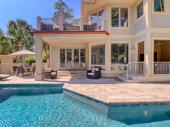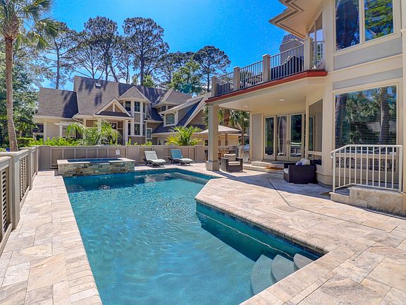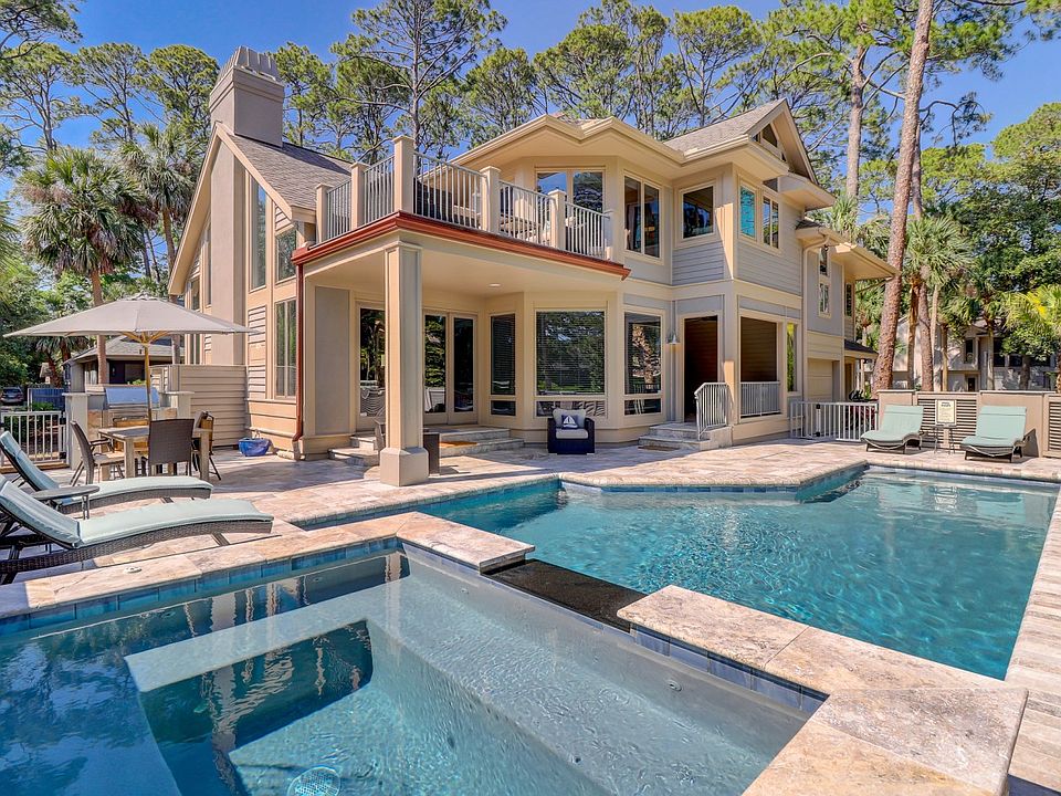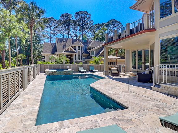Located 2nd row from the beach, you will find this 5 bedroom, 6 bathroom, completely renovated Sea Pines charmer. The open great room offers rustic finishes such as shiplap walls and ceiling and reclaimed wood mantle and accents. The open kitchen has large island, stainless steel Viking appliances and plenty of storage. The first of five bedroom suites can be found on the main level. Additional bedrooms are on the mid and upper levels, offering plenty of privacy. The upper level has a 2nd living space, fun bunk room and balcony overlooking the spacious patio, pool and hot tub. Offered fully furnished, this home is summer ready!