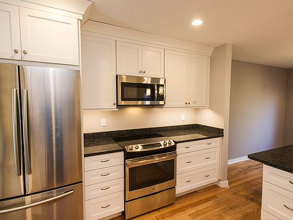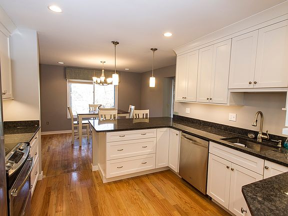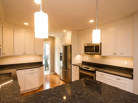 Best kitchen and best location in High Meadow! Brand spanking new kitchen open to dining room (unique for HM), and in the best location, overlooking the fountain with western sunset exposure. New entry & kitchen floors (& others refinished), unit freshly painted, new a/c heat pump, new hot water heater, main floor powder room updated. En suite master bedroom and en suite in second bedroom as well! Big living room with fireplace. Lower level divided into two rooms, with one room doubling as guest room, exercise studio, entertainment center, and has walk out to patio overlooking the lovely pond with fountain. This is a quiet unit, in a great location within the community.