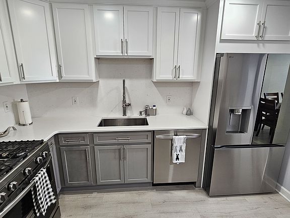 Updated kitchen with stainless-steel appliances, ample cabinetry, and breakfast bar