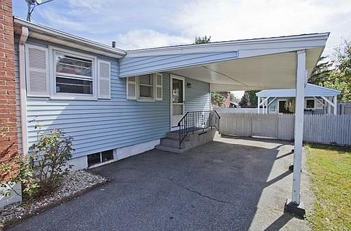Buy Holyoke Now ~ Cozy 2-3 bedroom Ranch (third bedroom being used as dining room, would need a little work to make back into 3rd bdrm) Said room has sliders leading to rear patio and two closets, square cut out/passthrough to kitchen with granite counter top. Large living features FirePlace with nice custom built bookshelves. Partially fished basement ads extra living space. Newer gas heat. Exterior features a lovely covered front Porch, carport, fenced in rear yard and large shed, cover and uncover patios. Move right in!