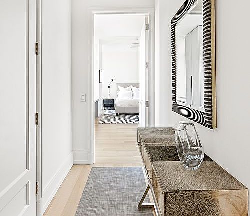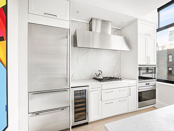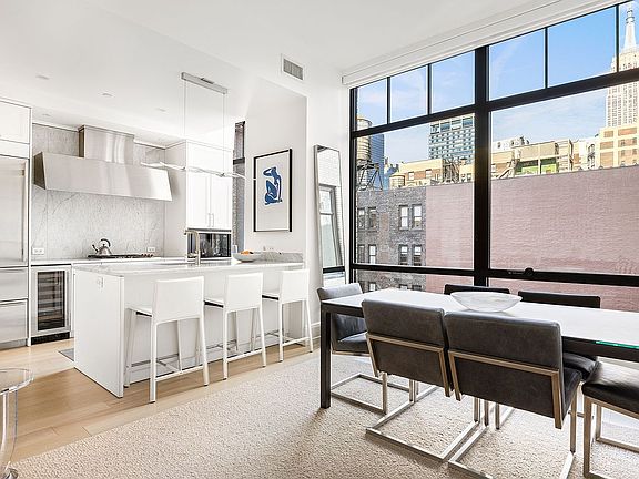 Upon entry through the 9-foot foyer, guests are greeted by a luminous living and dining area, featuring expansive picture windows framing captivating vistas of the iconic Empire State Building. The ambiance is heightened by the seamless flow of wide-plank white oak floors, soaring 10-foot-plus ceilings, and bespoke hardwood doors complemented by custom Nanz hardware.
