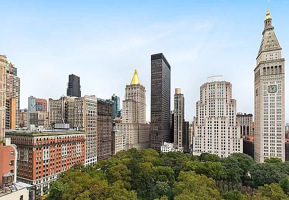 Elegance envelops you in this gorgeous 4 bedroom 4.5 bath Flatiron apartment boasting 2,818 sq ft of impeccably designed interiors and awing views of Madison Square Park, grand architecture, and the dramatic city skyline! Perched on the 15th floor of a premier condominium in the heart of Manhattan, enhanced by a host of upscale amenities. Residence 15F is an upscale oasis with insulated floor-to-ceiling windows in the expansive great room as well as all 4 bedrooms, facing east and west respectively, capturing fabulous sunrises and sunsets over NYC. Custom blackout room-darkening and light-filtering shades covering all windows are electronically controlled by Crestron. The high-end audio-video system is also operated by Crestron, with every room wired for TV. Airy ceilings, rich wide-plank wood floors, tasteful moldings, refined finishes, and custom-outfitted closets with California Closets built-ins additionally grace the ambiance. A long gallery hall with a walk-in coat closet greets your arrival and proceeds to the generous entertaining area with a sleek open kitchen flooded in natural light. Modern chef's quarters are well-appointed with Bianco Carrara marble counters and island, and premium stainless steel appliances by Wolf, Miele and Sub-Zero including a capacious wine fridge. A nearby powder room is conveniently positioned for guests. Sun-drenched bedrooms provide a quiet place to unwind featuring custom closets, spa-like en-suite baths, and fabulous city vistas. Your huge primary suite is a serene retreat with 2 walk-in closets and a Carrara marble-clad bath with radiant heat floors, dual sinks, soaking tub and oversized shower. Added comfort is afforded by an in-home washer-dryer and central heat and air. What's more, 2 storage units are available to purchase for an additional $50K per unit over the sale price. Capital contribution of 2 months common charge paid by buyer 10 Madison Square West, built in 1915 and converted to a condominium in 2013, is both a work of art and a coveted living destination overlooking historic Madison Square Park and Worth Square. Extensive amenities elevate the lifestyle, such as 24-hour doorman and concierge service, a porter, live-in resident manager, 10,000 sq ft residents' club, 60 ft heated lap pool, hot tub, state-of-the-art fitness center, yoga & Pilates studios, spa treatment room, locker rooms with steam & sauna, children's playroom, lush courtyard garden, private storage, secured bike storage, the list goes on. Vibrant city living is yours amidst a myriad of shops, restaurants, nightlife, entertainment and transportation options.