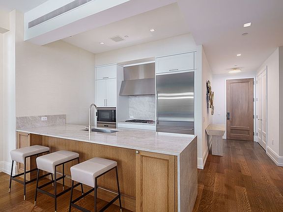 A formal entrance hallway leads to the spectacular south-facing living room, ideally proportioned for everyday living and sophisticated entertaining. There is an eat-in gourmet kitchen with custom SieMatic cabinetry and a 10'6" long breakfast bar with marble countertops providing a generous space for dining. The kitchen is equipped with top-of-the-line appliances including a Subzero refrigerator with two freezers drawers, Subzero wine refrigerator, Wolf range, Wolf oven, Wolf built-in microwave, and Miele dishwasher.