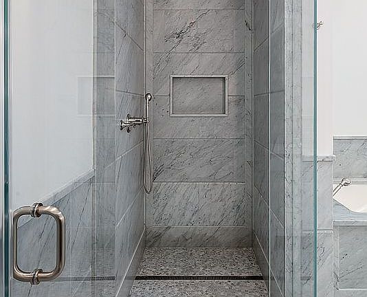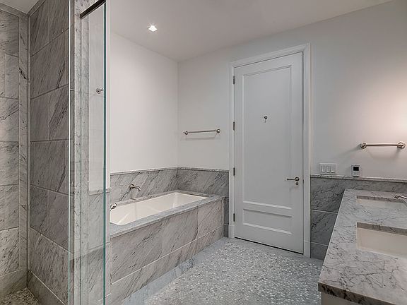 A grand primary bedroom suite faces south with two enormous walk-in closets. The magnificent en-suite primary bathroom is finished in Carrara marble and has two sinks, a walk-in shower with a rain showerhead, a separate deep soaking tub, and radiant heat in the floors. The second bedroom also faces south and has a walk-in closet and an en-suite renovated bathroom with a bathtub. A powder room, coat closet, and laundry area with Maytag washer/dryer complete the residence.
