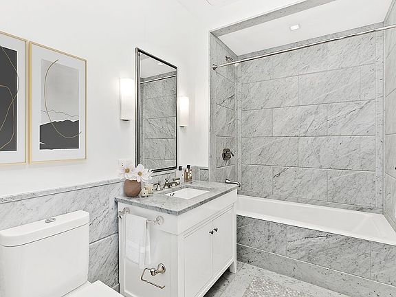The comfortably sized bedroom offers a full wall closets that have been elegantly outfitted with California Closets. The oversized bathroom features a Carrera marble double sink vanity, shower and deep soaking tub.
