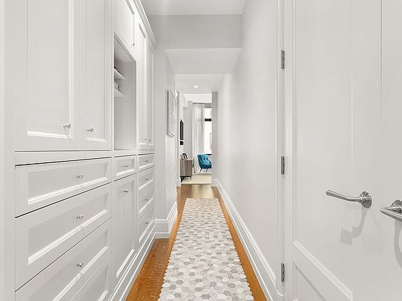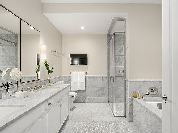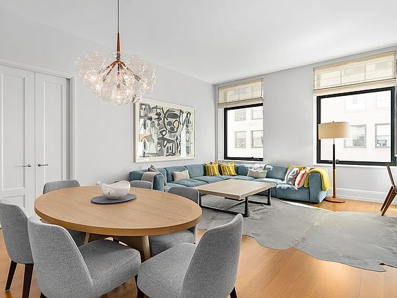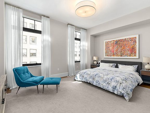 This 1,690-square-foot home features soaring ceilings, hardwood floors, and oversized south-facing windows throughout. The spacious great room provides a generous footprint for living and dining areas, and the open kitchen featuring a stunning marble island and an army of top-of-the-line stainless steel appliances from Sub Zero, Wolf, and Miele, including a hooded gas range, dishwasher, built-in microwave and wine refrigerator. The two bedroom suites include Citi-quiet windows, and the primary suite also features custom-built cabinetry, two fully-outfitted closets, plus a marble bathroom with radiant heat floors, soaking tub, glass shower, and wide double vanity. This home offers central heat and air, an in-unit washer-dryer, electric solar shades in the living room, plus blackout shades in the primary suite. Electrical and audio-visual systems have been updated to include Sonos connections to every room in the apartment.