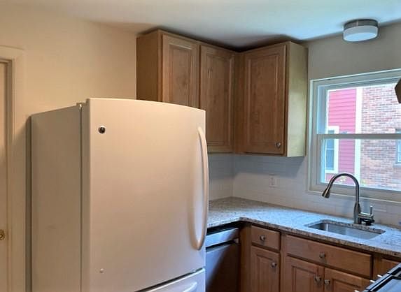 Newly renovated Kitchen with granite countertop and new appliances, proximity to the Newton Centre T Stop, restaurants, shops, parks, 2 good sized bedrooms, one bath unit. One large room with a designated area for a dining room table. There are hardwood floors throughout. There is plenty of storage space and a separate sunroom off the rear for home office use. There is some basement storage as needed. 2Car driveway parking and off-street parking are available. This property is situated in Bowen Elementary, Oak Hill, and Brown Middle Schools. Newton South is the designated High School. Laundry in the basement. No Pets