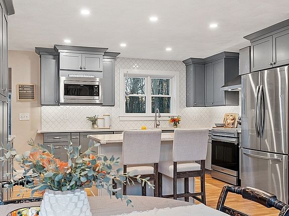 Welcome Home! Updated 3 bedroom, 2 bath ranch has everything you need. Remodeled kitchen featuring Quartz counters, tiled backsplash, stainless appliances, recessed lighting and even a pop up charging station on the kitchen island. The family room features cathedral ceilings, a slider to the backyard and its own ductless mini split system. The primary bedroom features a slider with a deck to enjoy your morning coffee overlooking the tranquil scenery around you. Hardwood flooring throughout the first floor. Both bathrooms have been completely updated. The finished lower level boasts a bonus area with new carpet and ceilings, recessed lighting and a built in bookshelf with plenty of storage. Lower level also includes an office and an exercise room. Fenced in yard with a Smart irrigation system. Central a/c, new oil tank, newer hot water tank and freshly sealed driveway. Minutes to 93 and the Commuter Rail. This house is perfect for a first time buyer, downsizer or anyone in between