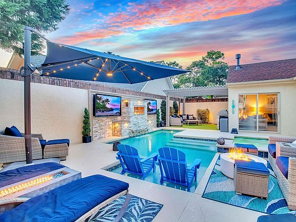 Heated salt water poolLedger tile fireplaceOutdoor gas fireplaceOne level livingGas heaterStainless steel appliancesVaulted ceiling