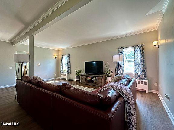Welcome to this charming 3-bedroom, 2-bath home in the heart of East Greenbush. Featuring a spacious and open floor plan flooded with natural light. The combined living and dining areas flow seamlessly into the kitchen, making it a great space for both everyday living and entertaining. The new luxury vinyl plank flooring through out adds to the homes cohesive flow. Enclosed porch has been converted into additional living space—ideal for a home office, playroom, or cozy reading nook. All three bedrooms are generously sized, and the layout offers both flexibility and function. Outside, a deck overlooks the small, fenced yard—easy to maintain and great for entertaining or relaxing. Detached 2 car garage for storage and ample off-street parking. Super convenient location, easy access to I-90, shopping, restaurants, shopping, and Regeneron. Sought after East Greenbush school district! NEW roof 2022.