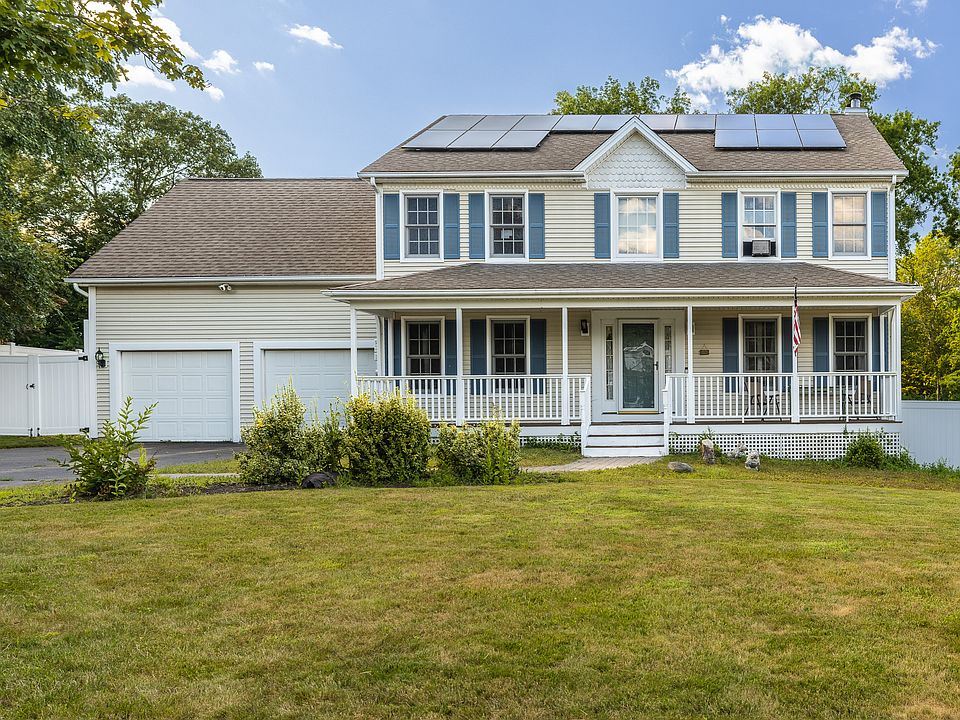 Welcome to this stunning 4-bedroom, 2.5-bath Colonial located in a highly sought-after neighborhood! A charming front porch & dramatic 2-story foyer greet you as you enter. The main level offers a spacious living room with French doors, a versatile den or home office, and an open-concept layout ideal for modern living.The heart of the home is the expansive kitchen featuring granite countertops, stainless steel appliances (including a brand-new refrigerator), an island with breakfast bar, & seamless flow into the dining area & cozy family room w/ wood-burning fireplace.Just off the kitchen, you'll find a convenient mudroom entry from the attached 2-car garage, and a dedicated laundry room with a brand-new washer/dryer.Enjoy year-round comfort in the inviting 4-season sunroom overlooking the fully fenced backyard complete with a brand new above-ground pool, new shed, patio, & deck, all set on a spacious, level lot perfect for entertaining.Upstairs, you'll find an oversized primary suite with his & her closets and a luxurious ensuite bath boasting dual vanities & a whirlpool tub. Three additional generously sized bedrooms & another full bath complete the second floor.The lower level offers a large finished game room or potential in-law suite with both heat & A/C. Hardwood flooring runs throughout most of the home. Additional updates include a soon-to-be-installed new oil tank in the basement. This home combines comfort, space,& convenience--all in a prime Location!