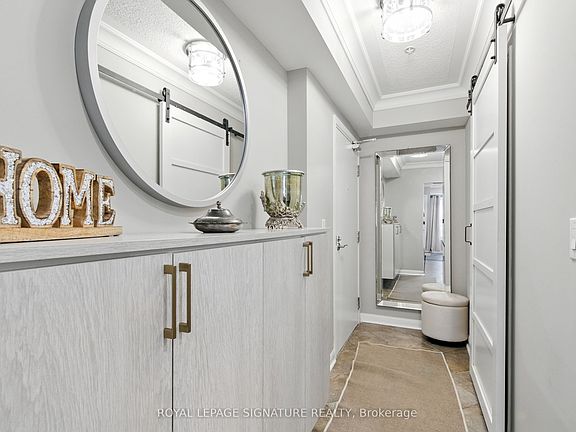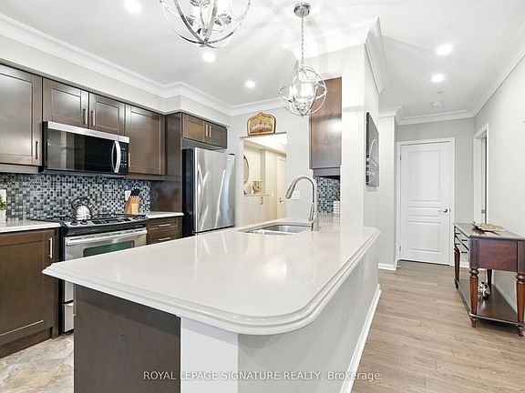 Welcome to this stunning 3-bedroom CORNER SUITE with its {nearly} private access, it truly has it all! Unit 106 boasts the best layout and finishes in the building, making it a must-see! As you step inside, you'll be greeted by timeless, wood-grain laminate floors and elegant crown moldings that flow throughout the entire space. The designer kitchen is a chef's delight, featuring quartz countertops, a sleek glass backsplash, and stainless steel appliances. The convenient breakfast bar is perfect for casual meals or a morning coffee. The spacious living and dining areas are bathed in natural light and lead out to a fabulous WRAP-AROUND TERRACE with tranquil views of the park. This balcony is an ideal spot to relax and enjoy your morning coffee or evening drink. The peaceful master suite offers a private retreat with a 3-piece ensuite, complete with a glass shower and granite counters. Two additional well-sized bedrooms provide ample space for a family, guests, or a home office. A Community You'll Love: Located in a fantastic, family-friendly community, this home is just steps away from beautiful parks and a recreation center. Enjoy the convenience of being just minutes from the subway, shopping, and the TTC. This unit also includes a fridge, stove, dishwasher, microwave/hood fan, washer, dryer, all electrical light fixtures, and custom blinds and window coverings. Don't miss the chance to experience this exceptional home. Come by and fall in love!