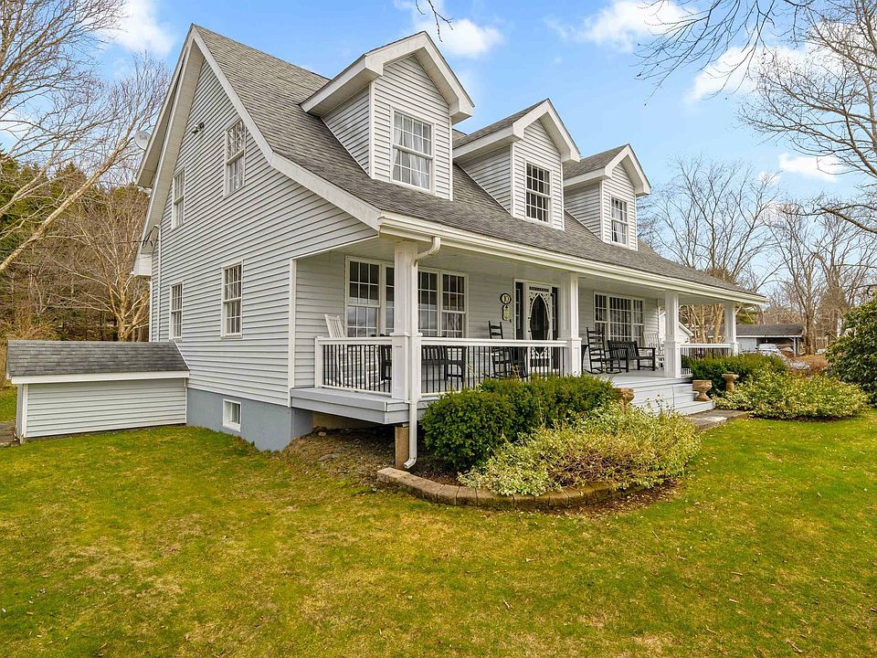 This move in ready and incredibly well maintained family sized Cape Cod Style home awaits you! From the circular driveway you are greeted by a park-like setting with mature trees, shrubs, and landscaped perennial gardens featuring a pond and pergola. Spectacular views of the lake can be enjoyed from several windows and the large covered veranda. The exterior is further enhanced by custom concrete stairs leading to your private dock/lake access; a double car garage, and a boat shed. The main floor of this home offers a classic floor plan with formal living and dining rooms, an open concept kitchen and family room with electric fireplace. Both the living and family rooms boast oversized windows providing plentiful natural light and views to the front gardens and lake. Up the oak staircase to the second floor, you will find a beautiful multipurpose space with custom floor to ceiling millwork. This area also features one of three window seats overlooking the lake. A stunning primary bedroom with an upgraded en suite and freestanding tub, two large bedrooms, an additional full bath, and laundry room with balcony to clothesline complete the upstairs living space. The recently renovated basement is a blank canvas ready to become the flex space your family may need. This property boasts deeded lake access with custom concrete stairs leading to a private boat dock on sought after Porters Lake, one of the most beautiful boating lakes in Nova Scotia. A double car garage and boat shed complete the exterior. With its blend of traditional architecture and modern upgrades, this property is ready for you to call it home!