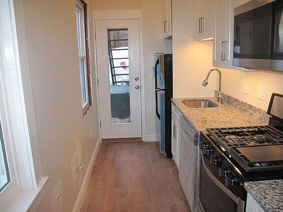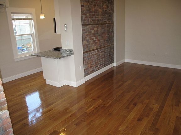 Union Square / Spring Hill area, 1 bedroom, 1 bathroom apartment. Includes in-unit laundry. Key amenities include air conditioning, an alarm, an exposed brick, hardwood floors, high ceilings, a living room, a modern bath and storage space. The modern galley kitchen includes dishwasher, disposal, gas range, microwave, granite countertops and stainless steel appliances.