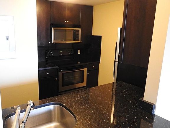 HIGH FLOOR! FORMER MODEL UNIT! GORGEOUS renovated one bedroom unit with wood floors in the living room and private balcony! Kitchen with wood cabinets, custom backsplash, granite counters & Stainless appliances. Building amenities include 24/7 concierge and valet parking,on-site property management,gym with lap pool and hot tub,business center,movie room,gathering and event room,shuttle service,laundry dryclean pick up and drop off,on site market with ATM. Steps to Galleria Mall shops,restaurants,river and T.
