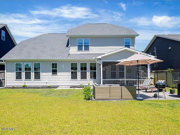 Nestled on a quiet cul-de-sac this 5 bedroom 4 bathroom house is a Wyndwater show stopper! Built in 2020 by Robuck Homes, this home was the model and has been meticulously maintained with tasteful upgrades through out. Backing up to farmland beyond the fence provides great privacy, serene views and great natural light. Entering into the spacious foyer your attention will be drawn to the beautiful open living room centered with a gas lit fireplace. The custom built-in shelving along with 9 foot ceilings set this home apart from the rest. The large kitchen island is well designed with perfect combination of functionality and aesthetic. Granite counter tops, white upper cabinets, tile back splash complete the space. French doors off the foyer invite you into the traditional dining room with coffered ceilings. Custom roman blinds provide an elevate look throughout the home. LVP flooring on the main floor and carpet in the upstairs. The primary bedroom is located on the main level with a big walk in closet and ensuite bathroom. Upstairs you will find four bedrooms and an unfinished bonus room extension that could be perfect for an office or work out room. Two of the rooms have ensuite style bathrooms with access to the main hallway. Moving outside, the large screened in porch opens up to an even bigger patio space. The backyard is fully fenced with well kept landscaping around the whole exterior. The irrigation system keeps everything nice and green. Plenty of room out back for a pool but you also have access to the neighborhood pool. This home is on water and sewer so no need to worry about a septic system. The Wyndwater neighborhood is in the Topsail School district and is only 10 mins from Topsail Island beaches. It sits perfectly 25 mins from Wilmington and 30 min to Camp Lejeune's Stone Bay gate. This gem will not last long so make sure to book your showing ASAP!