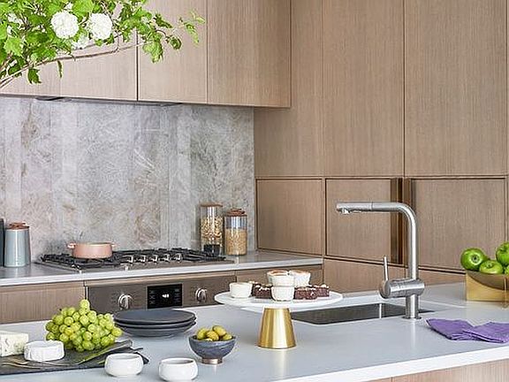 With interiors designed by ODA New York, The Brooklyn Grove features a subtle mingling of organic materials and lush textures. Each room offers unexpected touches and welcome surprises including wide plank oak flooring throughout. In the kitchen, custom rift oak cabinetry strikes a distinct contrast against the concrete-hued Caesarstone countertop, Taj Mahal stone backsplash, and antique brass hardware. The elegance of the bathroom is perfected with two types of marble and stone mingling to create a neutral palette that lets the world fall away. A composition of Santa Marina stone tile walls, Waterworks fixtures, and oak vanity with Fior di Bosco countertops complete the bath.
