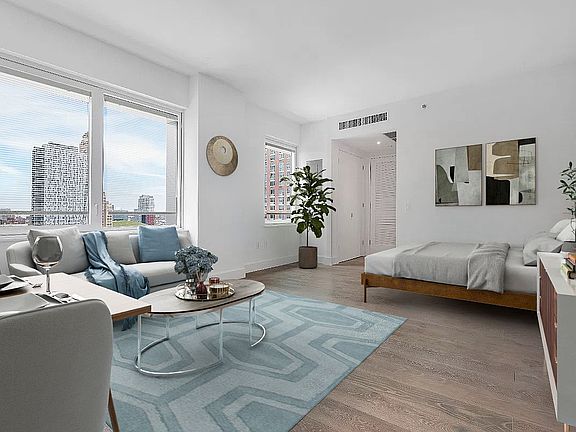 High floor, east-facing big windows, open studio, brings tons of lights to the living space. Designed by ODA New York, The Brooklyn Grove features a subtle mingling of organic materials and lush textures. Wide plank oak flooring throughout the entire space. A gourmet kitchen featuring custom rift oak cabinetry strikes a distinct contrast against the concrete-hued Caesarstone countertop with a Taj Mahal Brazilian quartzite backsplash and antique brass hardware. The bathroom is perfected with two types of marble and stone to create a neutral palette that lets the world fall away. A composition of Santa Marina stone tile walls, Waterworks fixtures, and oak vanity with Fior di Bosco countertops complete the bath. The unit comes with Bosch washer/dryer. The Brooklyn Grove’s multi-textured design story continues with the residents’ lounge, located in a soaring space with 22-foot ceilings, a fireplace, pool table and screening area. The rooftop lounge features beautiful views, with lounging and dining areas, and BBQ grills for gatherings. Wellness amenities include a 40-foot indoor swimming pool and fitness center with yoga room. The private dining room is a place to bring friends and family together for celebratory dinners and drinks. Parking, a children’s playroom, pet spa, package room with cold storage, private storage, and bike storage round out the extensive amenities offering. Many restaurants and shops are near by, including Whole Foods, Trader Joes, Target. There are 12 subway lines take you to any where in NYC. Walking distance to LIR.