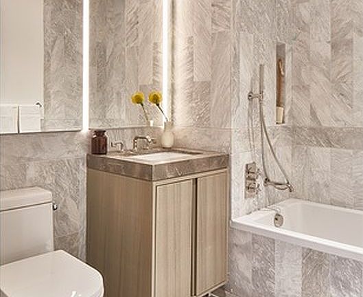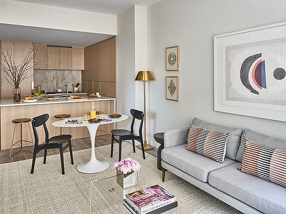 With interiors designed by ODA New York, The Brooklyn Grove features a subtle mingling of organic materials and lush textures. Each room offers unexpected touches and welcome surprises including wide plank oak flooring throughout. In the kitchen, custom rift oak cabinetry strikes a distinct contrast against the concrete-hued Caesarstone countertop, Taj Mahal stone backsplash, and antique brass hardware. The elegance of the bathroom is perfected with two types of marble and stone mingling to create a neutral palette that lets the world fall away. A composition of Santa Marina stone tile walls, Waterworks fixtures, and oak vanity with Fior di Bosco countertops complete the bath.