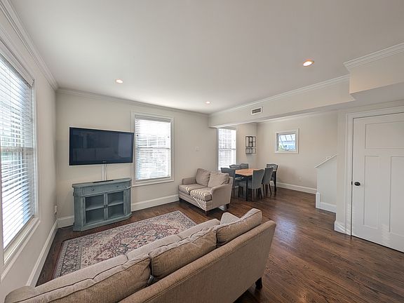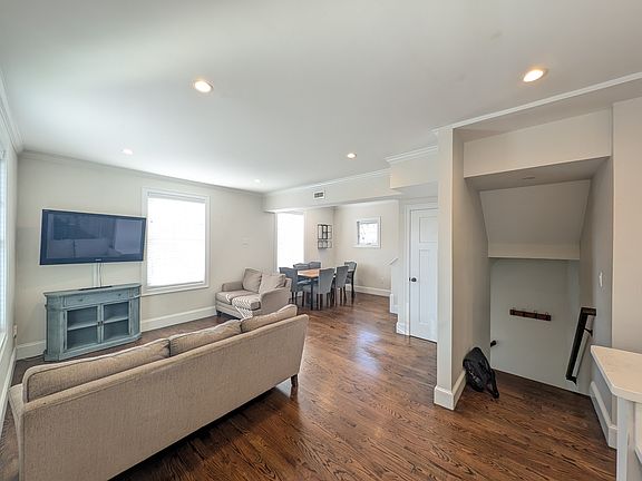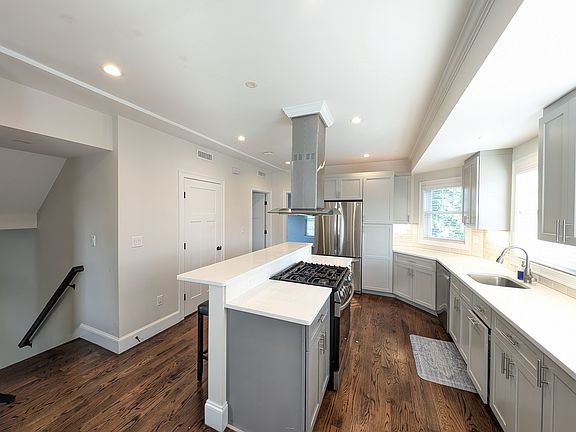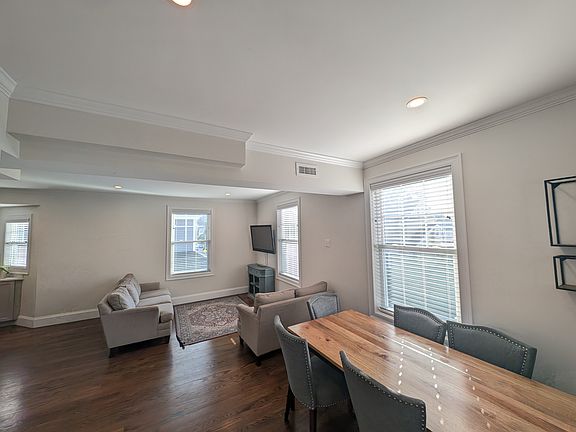 Stunning 3 bedroom duplex in outstanding Roslindale location! Completely renovated just a fews ago. Architect designed with open concept and dark wood floors throughout. High and vaulted ceilings. The kitchen features a large breakfast island, gray cabinetry, quartz counters, five burner gas stove, hood vent, subway tile backsplash and a breakfast bar. Bathrooms include designer tile work, quartz vanities and new appliances. 600+ sq. ft. 3rd level family room w/ french doors, beamed ceiling and deck with treetop views, plus 2nd master bedroom with ensuite bath and walk-in closet. Off-street parking, central air, and laundry in unit! A must see! fixed
