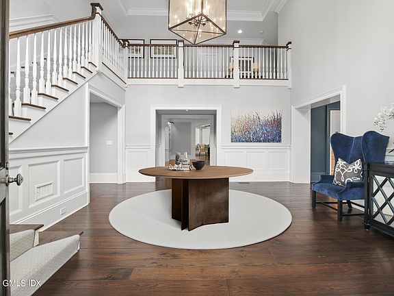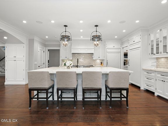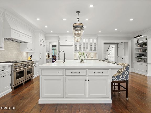 Spacious and gracious stone/clapboard Georgian, beautifully renovated, with 1 acre on a quiet cul-de-sac in the Riverside estate area. Soaring entry foyer with coffered ceiling invites you to beautifully scaled living room with stone fireplace and dining room with amazing new butler's pantry. Nothing is formal but everything is welcoming, especially the newly renovated kitchen with separate dining area and adjoining family room. The wow factor is the family room glass wall, which opens completely to a newly constructed outdoor room, usable 365 days with built-in heaters, mechanical screens, large fireplace, full outdoor kitchen and skylights. Gorgeous views of the stone patio, gardens, woods in the back, outdoor cabana area and pool (w/ auto cover). Six bedrooms, all ensuite, including a