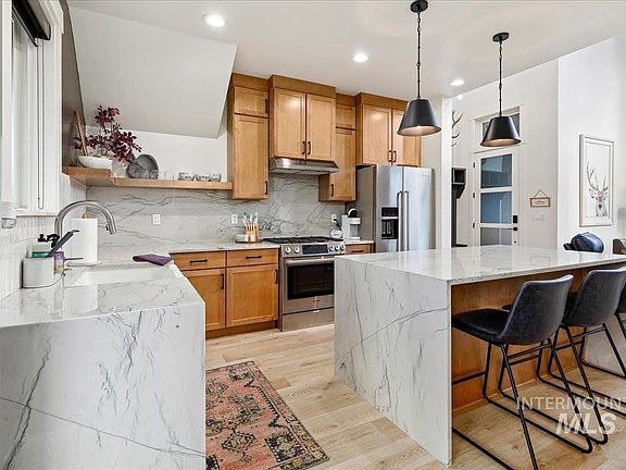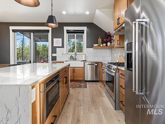 A buyer’s dream mountain retreat! Turnkey cabin built in 2021 on over an acre of land with a custom-made bike track weaving through the property, natural tree surround, and outdoor firepit. Property backs to a street that offers a path to a waterway for floating and fishing, Lake Cascade is around the corner, 10-minute drive to world class mountain biking, hiking & skiing at Tamarack Resort, and West Mountain snowmobiling trails are nearby. A special location with functional split floor plan featuring primary suite on the west side and 2 additional bedrooms on the east side. Loft or bonus space for game room or home office. The great room offers an abundance of windows, southern exposure floods the home with light, 19 ft ceilings, and a stunning stone fireplace for evenings after a long day out. Kitchen offers classic white oak cabinets, Bosche appliances, and waterfall quartz island & backsplash. Dining area opens to the rear patio for evenings out by the fire. AC, new blinds, & room for trailer parking.