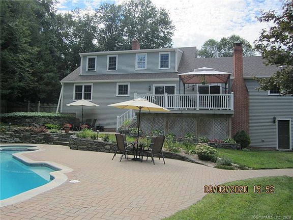 End of the culdesac on a level private lot-10 Room Col with 5 bedrooms and 3.1baths. Possible in law with own entrance and access to the rest of the home and the beautiful back yard with in ground heated gunite pool and spa Well taken care of inside and out with updated mechanicals and manicured lawn and just enough gardens to leave time for a dip in the pool or just relaxing on the surrounding paver patio and later enjoy dinner out on the new no maintenance deck overlooking the expansive grounds . Inside- there is a den with builtins, a fireplace and sliders to the outside; a large eatin kitchen with a breakfast bar and another set of sliders to the outside; the dining room and living room (with another fireplace are connected by french doors and lots of windows for natural light. A family room, study/bedroom, and 1.1 remodeled baths complete the first floor. The 2nd floor has 4 bedrooms and 2 full remodeled baths. The lower level is ready to be finished if additional living space is needed. Vacation at home and have easy access to amenities and highways.