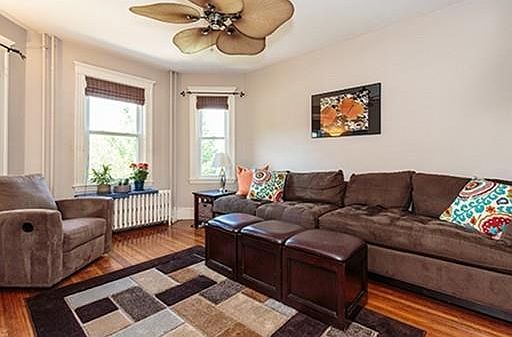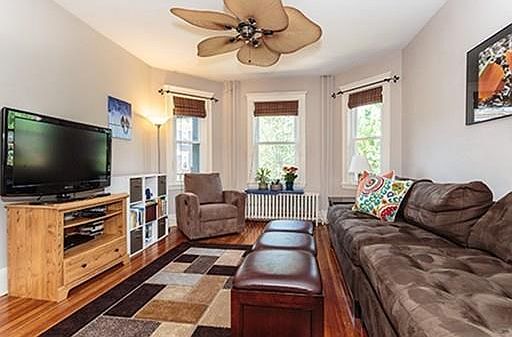 Beautiful two bedroom, one bath condo on a tree lined residential street close to all the JP amenities. Both bedrooms feature large, deep closets with great storage space. High ceilings, gorgeous hardwood floors, and large bright windows throughout. Spacious, open living area is ideal for entertaining. Updated eat-in kitchen with granite counter-tops has a great pantry with in-unit laundry. Front and back porches, large yard and nicely landscaped front entrance. Property sits high off the street. Other amenities include private basement storage, blown-in insulation, new windows, and original built-in china cabinet. Only a 1/2 mile walk to the Green Street T Station, makes this a great location for Boston commuters.
