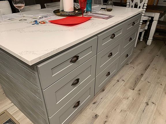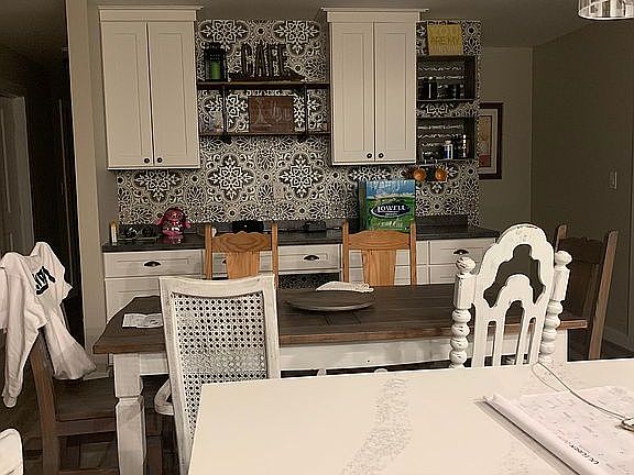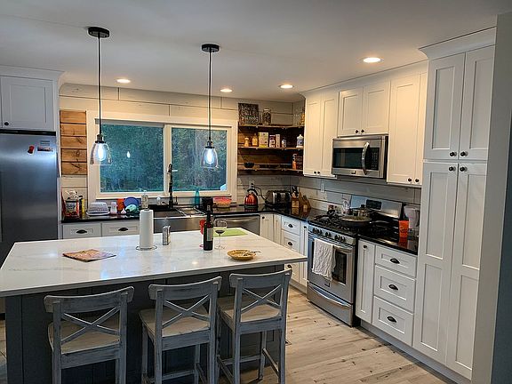 Totally renovated open floor plan ranch home with a large island and an eat in area in the kitchen, granite countertops, renovated bathroom with a tub, double sinks and extra storage. Hallway with 2 closets, laundry in the basement and a large deck with a grill