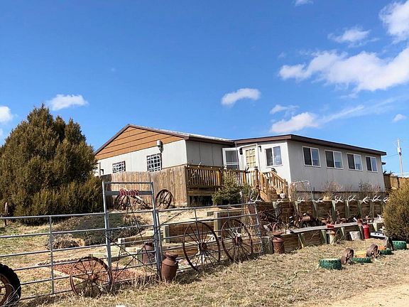 The home consists of two perpendicular single wide trailers with additions. Lots of square footage. There is room to build a new residence on the front section of the lot. There are two barn structures.