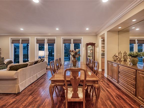 Within the guarded gates of Coto de Caza sits 10 Pegasus, a beautiful 5 bedroom 4.5 bathroom home plus a bonus room and an office. Before you even step foot into this home you are immediately struck by its magnificently inviting curb appeal. As you enter through double doors you are greeted by a stunning entry with soaring ceilings, wood floors and a dazzling chandelier. To your left is a spacious executive office with built-ins and floor to ceiling shelving. The formal living room is the perfect place to entertain guests with a large beautiful fireplace, wall length mirror and stunning views of the backyard. Chef's kitchen is complete with butler's pantry, center island with bar seating and built-in gas range cooktop, walk-in pantry, menu desk and double ovens. The kitchen opens to the family room that boasts a charming brick fireplace and panoramic views of the rolling hills. Downstairs includes a guest bedroom and a full bathroom. Ascend the wood banister staircase to the second level where you will find an expansive bonus room with built-in entertainment center. Spacious master suite is the perfect relaxing getaway complete with two walk-in closets, separate tub and shower, his & hers sinks and vanity area. Three secondary bedrooms (one with en suite bath) and laundry room complete the upper level. Wonderful backyard to entertain featuring a pool & spa, grassy area and large patio perfect for seating.