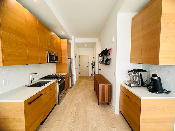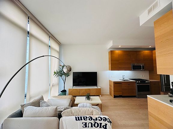 Welcome to this stunning south-facing studio at 10 Provost offers extra high ceilings and a sleeping alcove that functions beautifully as a bedroom. The home features a spacious open layout designed for comfortable living. The kitchen is equipped with high-end Thermador and Bosch appliances, sleek quartz countertops, and custom cabinetry. Wide plank oak floors add