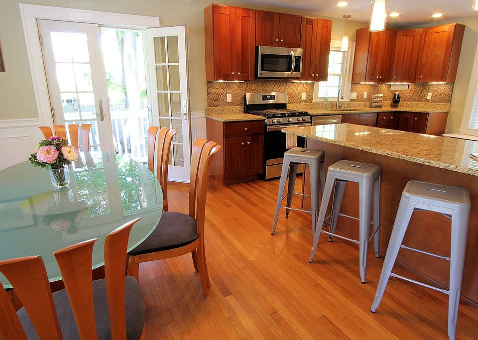 - Kit Dscrp: Flooring - Wood, Dining Area, Countertops - Stone/Granite/Solid, Cabinets - Upgraded, Breakfast Bar / Nook, Stainless Steel Appliances, Open Floor Plan, Remodeled, Exterior Access, Peninsula, Lighting - Pendant