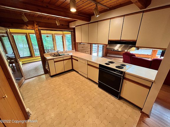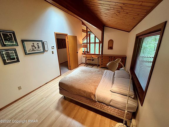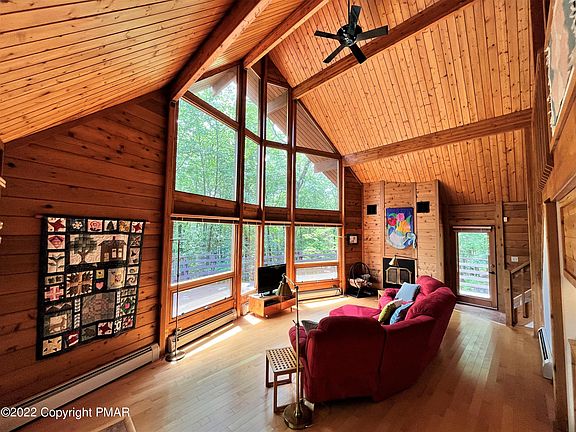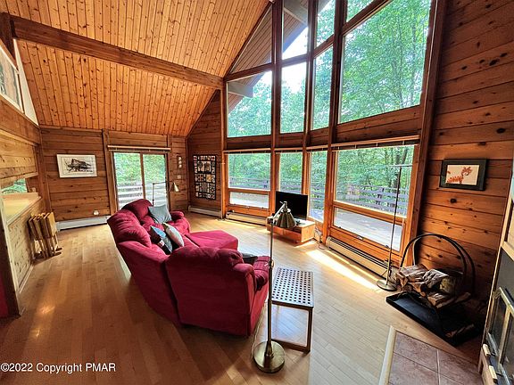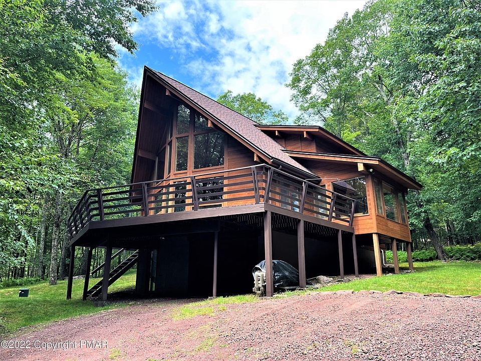 Gorgeous 4 bed/2 bath CEDAR SIDED CHALET on 1.15 ACRES w/ BUILT-IN 1 CAR GARAGE in BEAR CREEK LAKES! This stunning home features a breathtaking main living area complete w/ VAULTED CEILINGS, WOOD BURNING FIREPLACE, WALL OF WINDOWS, EXPOSED BEAMS, & TONGUE & GROOVE WALLS & CEILINGS! Spacious third floor bedrooms provide beautiful views into the main living area! Second story bedrooms enchant w/ rich tongue & groove ceilings & walls! Charming dining room w/ TILE FLOOR, ACCENT WALL, & NATURE VIEWS! Oversized wrap-around FRONT DECK & SCREENED-IN SIDE DECK are perfect for relaxing in the Poconos! Plenty of storage space w/ the unfinished first floor! Enjoy BCL's 160 acre lake, marina, 2 beaches, Olympic sized swimming pool, & more! Minutes to downtown Jim Thorpe! Great commuter location!