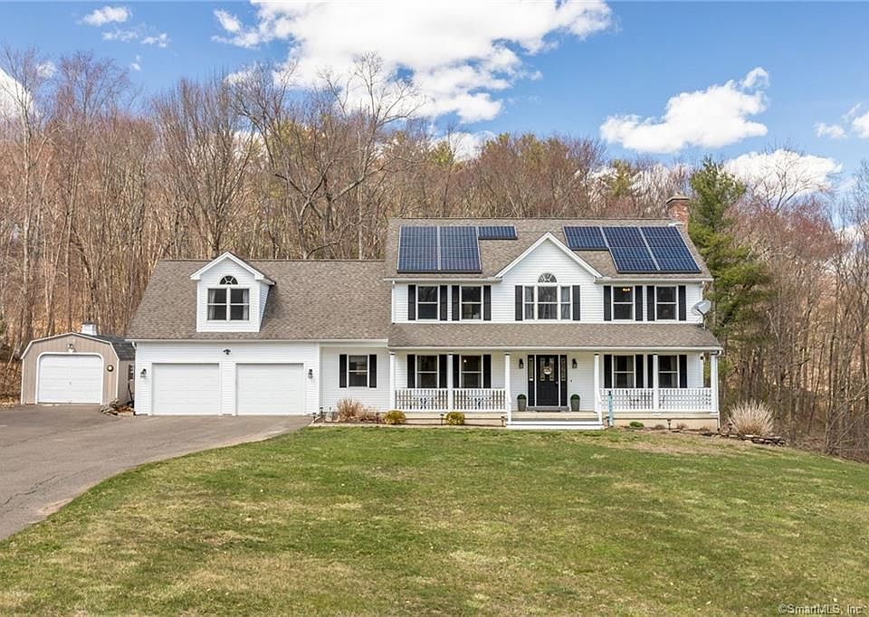 Stunning views! This move in ready (4) Bedroom Colonial is located on the end of a cul-de-sac neighborhood on a 2 acre lot. The country front porch greets you as you walk up to the front entrance. The entrance from the (2) car attached garage enters into a desired mudroom, the perfect place for sports gear, coats and shoes! Located off the mudroom is a 1/2 bath with laundry area. The main level has a wonderful floor plan and has hardwood flooring. Enjoy flexible dining spaces for formal and informal gatherings. Currently the formal dining room is being used as a in-home office. The kitchen offers stainless steel appliances and a large center island with breakfast bar. The kitchen flows into the front to back living room with brick fireplace with gorgeous custom woodwork surround. The Master Bedroom with full bath is located on the upper level. Three additional bedrooms and full bath are also located on this level. This home also has a (1) car detached garage, central air and energy efficient solar panels!