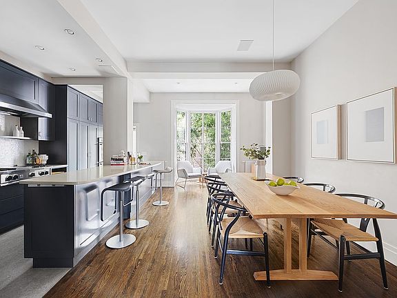 The aesthetics will appeal to lovers of old and new alike, and make the perfect backdrop for whatever style you fancy. Lending the kitchen a modern farmhouse vibe, the chef's kitchen on the parlor floor features 14' ceilings and blue/gray Shaker-style cabinetry. Paneled appliances include only the best: a 48" SubZero Fridge, Miele dishwasher, Thermador double oven, a Blue Star range and SubZero wine fridge. A quartz island and countertop offer incredible prep space, complemented by a white-mosaic backsplash. The kitchen offers space for grand entertaining and overlooks the garden through floor-to-ceiling bay windows. Head into the front parlor where city views come into focus through oversized windows that bathe the room in the warmth of sunsets. Sit your guests around a gas fireplace with modern appeal and old-world charm.