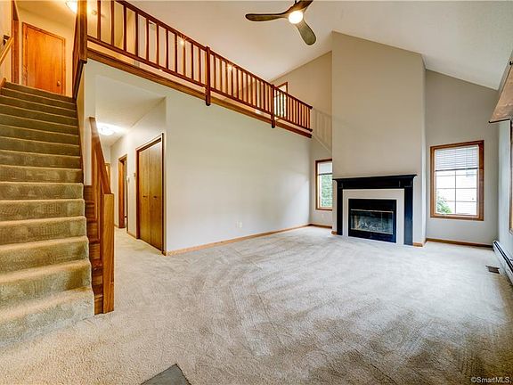 A super stand alone "Single Family" style unit at The Mill at Stonecroft. Rarely available in this location of the complex with much privacy and backing up to woods and lovely natural setting. This is a 55 and older community nicely set back off of the main road, but super close to downtown Hebron for easy access to everything you need. Restaurants, shopping, grocery, churches, CVS/Dunkin and so much more! This is a spectacular LARGE unit with an open floor plan. The living room has a fireplace and vaulted ceiling for a great "airy" feel. There is a good sized dining room, and an additional "eat-in" area in the kitchen. The kitchen has all stainless appliances and is in nice shape. It features a rear door that leads right out to your covered deck, facing woods and all sorts of nature and wildlife. There is a master bedroom on the first floor that has a big walk in closet, and a full bathroom with low entry large shower stall. 1/2 Bath as well. Upstairs is an additional bedroom with large walk in attic storage. There a full hall bathroom, plus a huge loft area, perfect for hobbies, exercise, office or an additional sleeping area if necessary. The basement is a full walkout to the back yard. There are endless possibilities for finished areas, work shop and hobby areas, or just loads of storage. The automatic Kohler generator was just replaced so you are storm ready. Public water and sewer and whole house Central Air! Well run association with stable fees.
