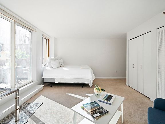 Delightful studio with 1 garage parking space & private balcony overlooking courtyard and reflecting pool. Located in desirable River Court, an elegant luxury condominium building on the edge of vibrant Kendall Square. Open living plan; large walk-in closet; c/air; in-unit laundry hook ups. Terrific as primary residence or a pied-a-terre. Unbeatable building amenities include 24/7 security monitoring & concierge, on site management, 6 elevators, fitness center, indoor pool, sauna, bike storage, guest pkg, 2 suites for guests & common roof deck patios with spectacular vistas of Boston & Cambridge. The Association is planning a substantial renovation project including new windows, exterior doors, roofs & more. Seller to pay currently anticipated assessment. Near Charles River Park, shopping, fine dining, multiple T-stations. Easy access to life sciences labs, MIT, Harvard, highways + Boston, just across the bridge. Luxury & convenience at its best!