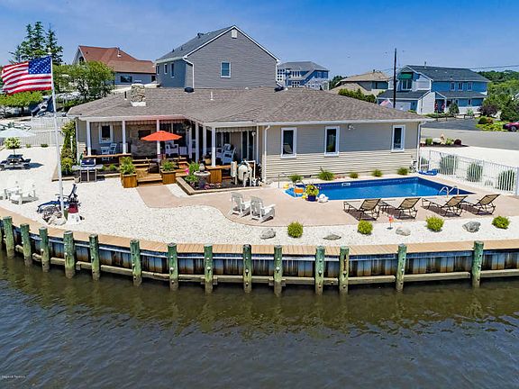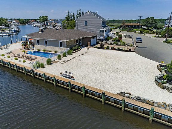 A True ''10'' Rebuilt from inside out. gutted to the studs, 2015 roof,windows,furnace,AC & Electrical panel. Shows like a model home .Water views from every room. 240 ft of waterfront -vinyl bulkhead & dock replaced in 2010 complete with water,electric & boardwalk around perimeter. Outside oasis in-ground pool, open porch with Mahogany flooring & deck. Outside speakers,pizza fireplace/oven,stamped concrete ,boaters paradise. Gourmet kitchen w/center island & Breakfast Bar. Other kitchen features-pendant lighting,.subway tile back splash,,custom Kitchenaid Stainless appliances, soft close draws,& St Cecilia Granite. Scrapped hardwood flooring throughout. Custom Baths with Driftwood ceramic tile. Master suite has walk in closet & private bath. 2 car garage with floored attic access .