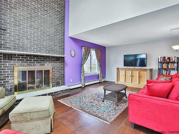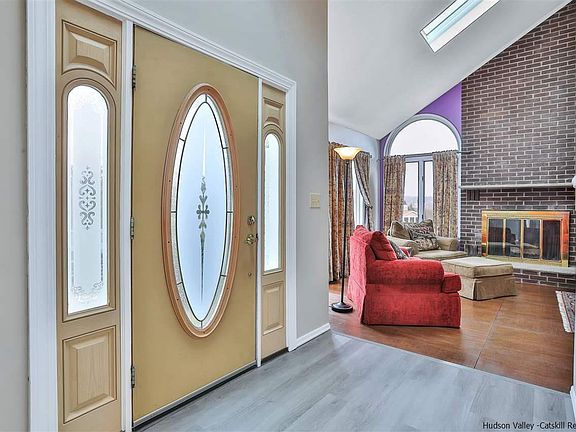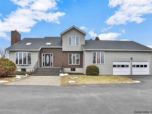 Spacious contemporary, privately sited on a quiet cul-de-sac in a picturesque neighborhood. Large eat-in kitchen opens to a formal dining room and a light filled living room with cathedral ceiling, skylights and brick fireplace. Working from home? There are two additional rooms on the main level, perfect for office (or guest) spaces. Second level features three bedrooms (main with ensuite) and another full bath. First floor utility and mud room. Central air. Oversized backyard stone patio is great for entertaining both large or smaller gatherings. Roof and siding replaced less than 5 years ago, new carpeting and paint. Move in, spread out, relax and enjoy. All set on 1.3 park like acres with great views and only minutes to town, farm stands, orchards and wineries.